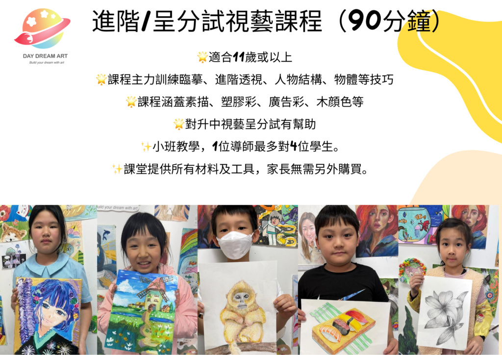 課程以臨摹作品、光影訓練及進階透視,學習木顏色、塑膠彩、廣告彩、油粉彩、水彩及馬克筆,課程內容對升中視藝呈分試有幫助,每堂會有影片同照片記錄學員成長。