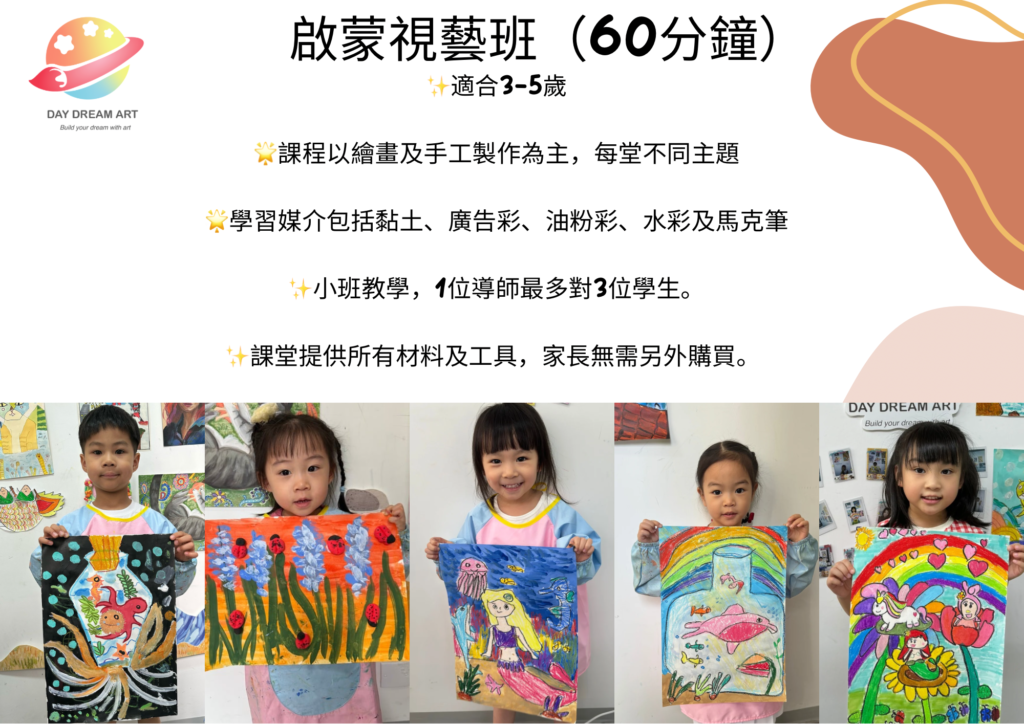 課程以繪畫及手工製作為主,學習媒介包括黏土、廣告彩、油粉彩、水彩及馬克筆。課堂主題圍繞日常生活設計,訓練幼兒控筆及專注力,建構日常知識,每堂會有影片同照片記錄學員成長。