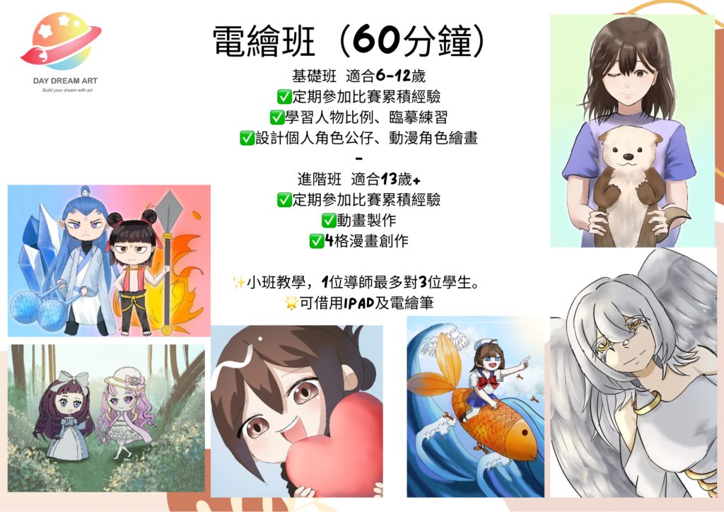 課程以學習Procreate為主,設計個人角色公仔、動漫角色繪畫、動畫製作等,每堂會有影片同照片記錄學員成長。